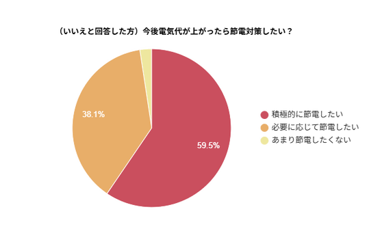 今は節電対策をしていない家庭でも、今後電気代が上昇すれば、59.5%の方が「積極的に節電したい」と回答しました。「必要に応じて節電したい」と回答した方も38.1%となっており、ほとんどの方が状況に応じて節電に取り組む意欲を持っていることが明らかになりました。