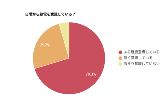 日頃から節電を「ある程度意識している」と回答した方が70.3%を占め、「強く意識している」と回答した方も25.2%に上りました。一方で、「あまり意識していない」と回答した方はわずか4.5%にとどまっています。