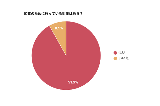 節電のために行っている対策があるかどうかアンケートを実施したところ、「はい」と答えた方は91.9%でした。この結果から、日常生活でできる工夫や電気使用量の抑制に取り組む方が多いことがうかがえます。