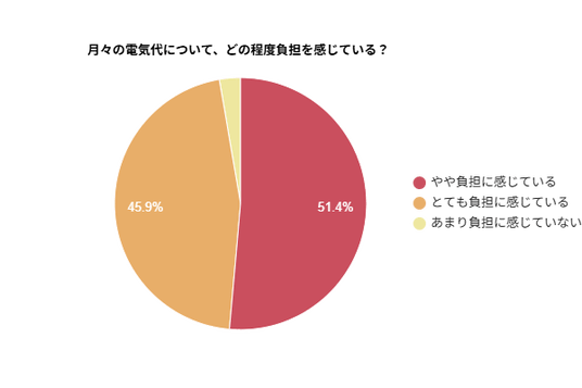 月々の電気代について「やや負担に感じている」と答えた方は約51.4%でした。さらに、「とても負担に感じている」(45.9%)を合わせると、約9割以上の方が家計への影響を強く感じていることが分かりました。