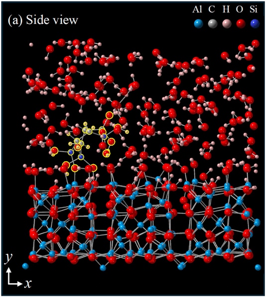 図3 BTSE分子が吸着したアルミニウムモデル表面の水分子との相互作用のシミュレーションの様子。黄色で色付けしてある分子が表面に吸着したBTSE分子。