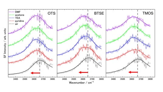 研究チームは、これまで材料表面や界面に存在する分子の情報を選択的に調べる手法として、和周波発生分光法(SFG分光法)(注2)を用いてきました。SFG分光法は、高強度のパルスレーザーを使い、材料を壊さずに界面での分子の振る舞いを詳しく調べることができます。このSFG分光法を用い、3種類のシランカップリング剤(OTS、BTSE、TMOS)(注3)で処理した表面の水酸基に注目して、ジメチルホルムアミド(DMF)、アセトン、トリエチルアミン(TEA)、ピリジンの4種類の異なる溶媒を接触させ調査しました。各溶媒と接した際の、基板表面に存在する水酸基のピークの位置の変化量から、それぞれのルイス酸塩基特性を調べました(図1)。その結果、基板表面に存在する水酸基のルイス酸性は、吸着するシランカップリング剤によって異なり、ルイス酸性が高い表面ほどエポキシ接着剤に対して強い接着強度を示すことを見出しました(図2)。