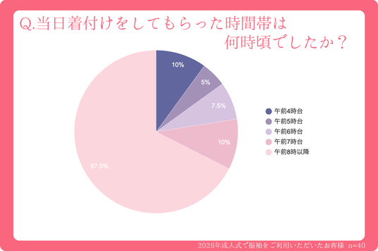着付けの開始時間は「午前8時以降」という最も動きやすい時間帯に予約が67.5%集中している一方で、残りの約3割は早朝7時前、中には4時台からの支度を余儀なくされています。人気のある「標準的な時間枠」がいかに早く埋まってしまうか、予約枠の争奪戦の激しさを如実に示す結果となりました。