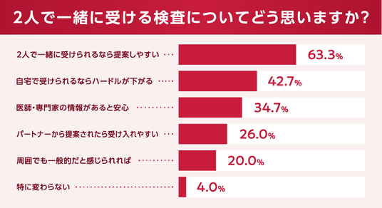 一方で、アンケート回答の中には、「2人で一緒なら受けやすい」「お互いの健康確認という形なら前向きに考えられる」といった声も見られました。