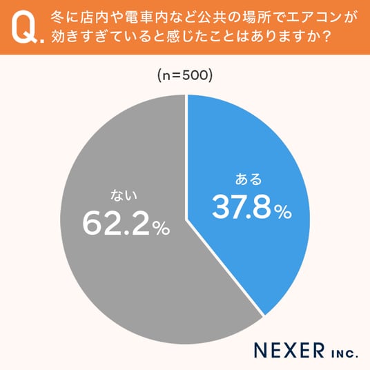 まず、冬に店内や電車内などの公共の場で、エアコンが効きすぎていると感じた経験があるかを聞いてみました。