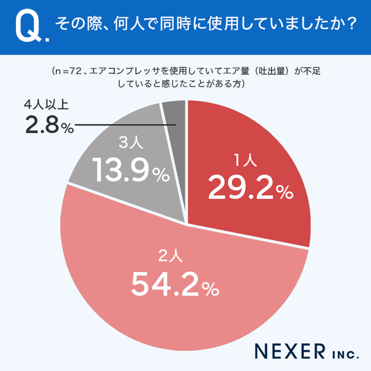 「2人」が54.2%と過半数を占め、「1人」が29.2%、「3人」が13.9%、「4人以上」は2.8%という結果でした。複数人での同時使用がエア不足の主な原因となっていることがわかります。