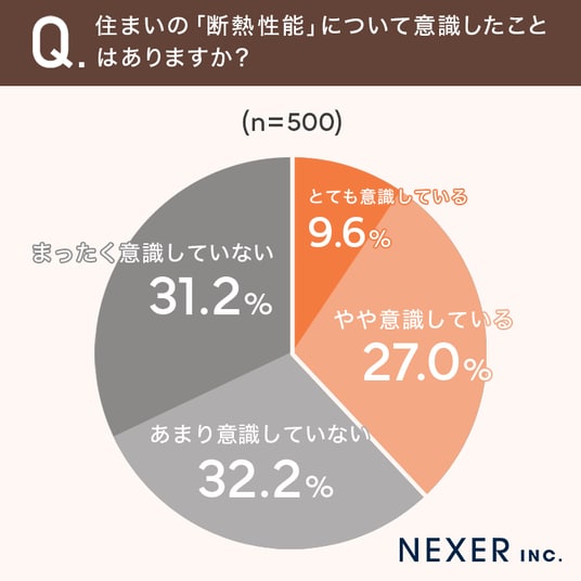 一方で「あまり意識していない」が32.2%、「まったく意識していない」が31.2%となり、6割以上が断熱性能をあまり意識していないことがわかりました。