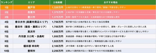 2位には西尾市と豊川市(土地総額1,375万円)がランクイン。豊川市は豊橋駅まで10~15分圏内、西尾市は西三河の主要都市へアクセスしやすい立地ながら、周辺相場より坪単価が手頃な点も人気のエリアです。国道へのアクセスも含め、車移動を前提とした生活動線の良さと価格のバランスが、納得感のある“穴場”として人気を博しています。