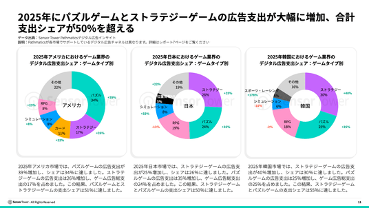 ストラテジーとパズルゲームの収益増加は、デジタル広告配信への投資強化と切り離せません。2025年、ストラテジーとパズルゲームのアメリカ、日本、韓国市場における広告支出シェアの合計はいずれも50%を超え、強い上昇トレンドを示しています。ストラテジーゲームのアメリカ、日本、韓国市場における広告支出はそれぞれ26%、25%、40%上昇し、パズルゲームはそれぞれ39%、35%、25%増加しました。
