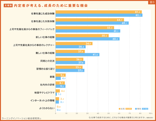 結果、どちらも「仕事を通じた成功体験」(文系:81.5%/理系:82.1%)が8割を超え、トップでした。2位に「仕事を通じた失敗体験」(文系:64.7%/理系:69.1%)、3位に「上司や先輩社員からの事後のフィードバック」(文系:55.3%/理系:61.1%)が続き、同じ順位となりました。