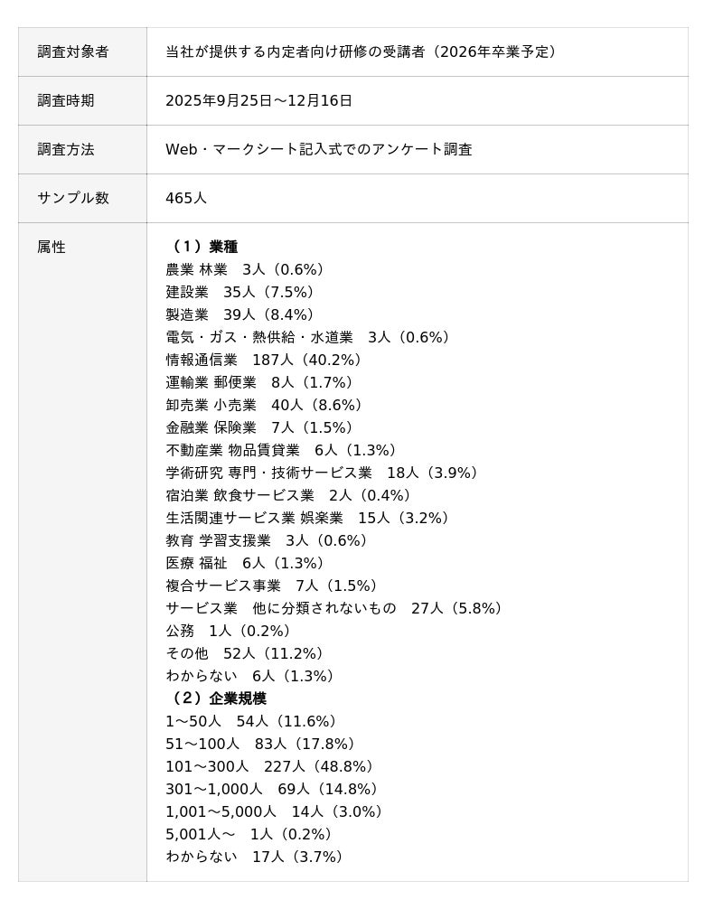 累計20,000社460万人以上の組織開発・人材育成を支援するALL DIFFERENT(オールディファレント)株式会社(所在地:東京都千代田区 代表取締役社長:眞崎大輔)および「人と組織の未来創り(R)」に関する調査・研究を行うラーニングイノベーション総合研究所(R)は、2025年9月25日~12月16日の期間で、2026年入社予定の内定者465人を対象に「内定者意識調査」を行いました。本リリースでは、26卒内定者が考えるキャリア観や内定先企業に求めるサポートなどについて、専攻分野による違いがあるのか、文系・理系にわけて分析した結果を公表します。