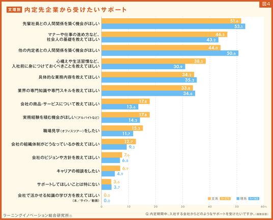 - 内定期間中に会社から受けたいサポート、文理ともに「先輩社員との関係築く機会」が半数超で1位。2位以下は文系・理系で違い(図4)