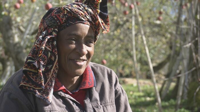 長野県飯綱町のりんご畑で働く小林フィデアさん。アフリカ・タンザニアから日本にやってきて30年、農家の嫁として、レストランスタッフとして、そして、母国の子どもたちを支援する活動家として生きてきた。「畑仕事やったことない。でも楽しい、りんごは」。そう笑顔で語る彼女の人生には、国境を越えた深い物語があった。
