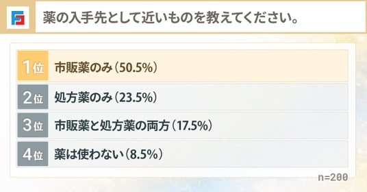 薬の入手先は、「市販薬のみ(50.5%)」が最多となった一方で、「処方薬のみ(23.5%)」や「市販薬と処方薬の両方(17.5%)」など医療機関で処方薬を使う人も一定数いる結果となりました。