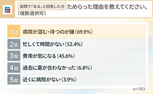 受診をためらった理由として最も多かったのは、「病院が混む・待つのが嫌(69.9%)」でした。次いで「忙しくて時間がない(52.4%)」が続きました。