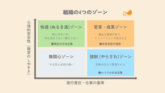 組織行動学(エイミー・エドモンドソン教授ら)の理論において、組織は「心理的安全性(話しやすさ)」と「仕事の基準・責任(実行力)」の2軸で4つのゾーンに分類されます。今回の調査データは、多くの日本企業が「強制(やらされ)ゾーン」から「変革・成果(イノベーション)ゾーン」へ移行しようとして失敗し、「快適(ぬるま湯)ゾーン」に迷い込んでいることを示唆しています。