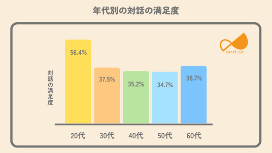 年代別に見ると、20代の対話満足度(56.4%)に対し、30代以降は30%台へと急落します。