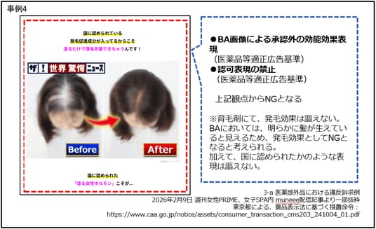 例6:育毛剤において、塗る植毛、誰にもバレずに生やせる、などの表現や、BA画像により、あたかも髪が生えるかのような表現。また白髪が生えてこなくなる、白髪ケア、などの白髪に効果があるかのような表現。