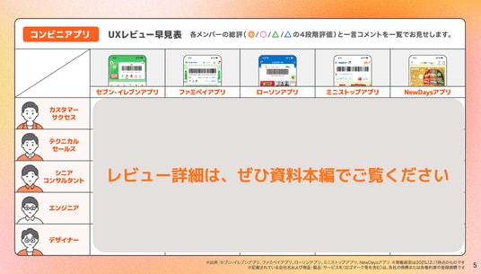 株式会社NTTドコモのマーケティング分野における新規事業型子会社である株式会社DearOne(本社:東京都港区、代表取締役:河野 恭久、以下:DearOne)は、主要コンビニ5社(セブン-イレブン、ファミリーマート、ローソン、ミニストップ、NewDays)の公式アプリを対象に、UX(ユーザー体験)の観点から徹底比較・レビューした「アプリUXレポート Vol.1 コンビニアプリ編」を公開したことをお知らせします。