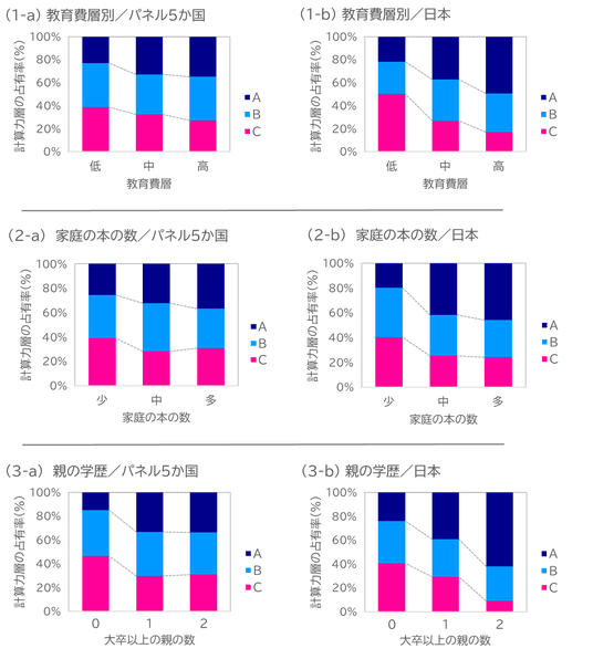 パネル5か国、日本の双方において、いずれの指標においても「低い/少ないほど計算力がC層(低め)の割合が高い」「高い/多いほど計算力がA層(高め)の割合が高い」という典型的なSES(家庭の社会経済的背景)の相関が見られました。いずれも、統計的に有意な結果となりました(p < 0.05)。