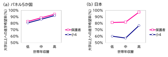 図3. 世帯年収層別にみた大学以上への進学を希望する割合の変化(小4)子ども・保護者ともに「大学または大学院」まで進学したい・して欲しいと回答した割合を示す。母数からは未回答、未定・わからない、その他は除外した。 (a) パネル5か国(アメリカ、イギリス、フランス、南アフリカ、中国)、(b) 日本。