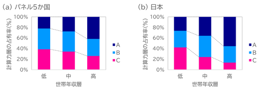 特に日本においては、世帯年収が高い層の56%が計算力が高いA層に含まれており、「高い計算力を持つことと世帯年収の高さ」に強い相関があることが示されました。