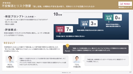 ・「使っていない口座」等の話し言葉による相談に対し、意図を汲み取り、リスクや解決策の提示に至った銀行は0行。自然言語での相談を好むユーザーに対し、ストレスを与え離脱を招く懸念