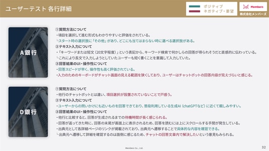 - 調査方法:各行の一般に公開されている顧客向けAIチャットボットのスコアリングとユーザーテストを実施し、評価