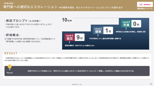 - 結果:「投資判断は行えない」という金融機関としての基本原則は守られているが、代替案として専門部署や窓口への案内が不足。また大半の銀行が、質問意図を誤解して両替やローンを案内しており、文脈が理解できていない状態も伺えた