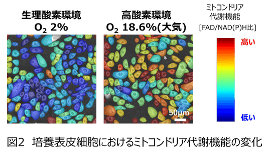 さらに花王は、そのメカニズムを検証するため、ヒト由来の培養表皮細胞を酸素濃度が異なる環境で培養し、自家蛍光スペクトル解析を行いました。その結果、酸素濃度の上昇に伴ってミトコンドリアの代謝機能が高まることが確認できました(図2)。この結果から、今回ヒトの肌に炭酸ガス配合組成物を塗布した際に認められた表皮細胞におけるミトコンドリア代謝機能の向上は、毛細血管拡張に伴う酸素供給量の増加が要因であることが示唆されました。
