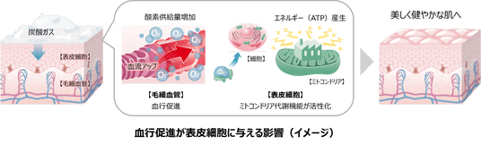 血行が促進されると肌の状態がよくなると言われており、花王でもこれまで、毛細血管の状態や機能に関する研究を通じて、血行と表皮の肌状態との間に確かに関連があることを見いだしてきました。しかし、血行促進することで、肌の細胞の中でどのような変化が起きているのか、そのしくみは実は十分に解明できていませんでした。炭酸ガスは肌に浸透すると毛細血管を拡張し、血行を促進することが知られています。そこで花王は、毛細血管拡張によって表皮細胞への酸素供給量が増えると、ミトコンドリアの代謝状態が変化することで、細胞そのものの機能にもよい影響を与えるのではないかと考えました。この仮説のもと、本研究では、血行を促す手段として炭酸ガス配合組成物を用いて、ヒトの肌上での検証を行いました。