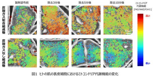 炭酸ガス配合組成物の塗布により表皮細胞のミトコンドリア代謝機能が高まることを、ヒトの肌で確認