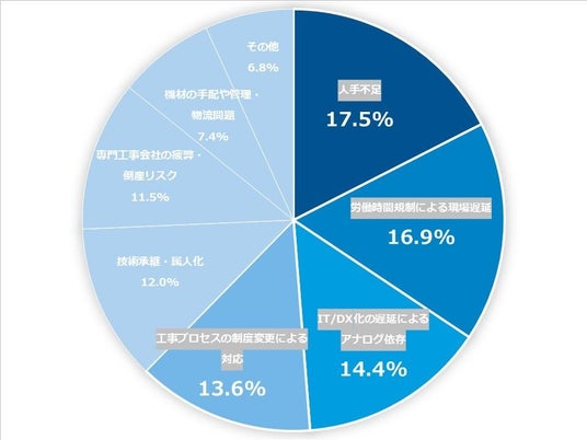 ・「建設2024年問題」「2025年の壁」の影響について尋ねたところ、「人手不足・高齢化」が17.5%で最多となった一方、「労働時間規制への非対応(16.9%)」「IT・デジタル化の遅れ(14.4%)」「従来プロセスの限界(13.6%)」も僅差で続き、課題が多岐にわたっている実態が明らかになった。