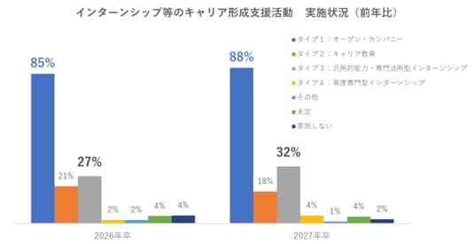 6月までに4割弱、8月には全体の8割が実施。一方、12月および翌1月の実施率は前年より約10ポイント減少しており、一部の企業では母集団形成から選考活動へと移行している可能性があると考えられる(図5)。キャリア形成支援活動においては、「オープン・カンパニー」を実施する企業が8割を超えており、最も実施率が高い。職場での就業体験を伴う「汎用的能力・専門活用型インターンシップ」は3割程度にとどまっているものの、前年よりも上昇傾向(図6)。学生側は「参加しやすさ」等の受動的な理由から目的意識を持った能動的な参加姿勢へ変化していることから、より実践的なプログラムへの関心が高まっていると考えられる(2025年実施 26卒学生対象の就活状況調査より)。