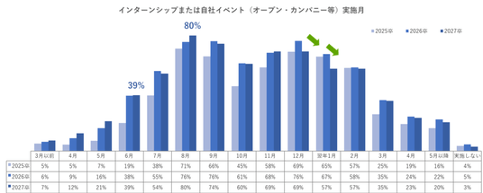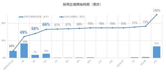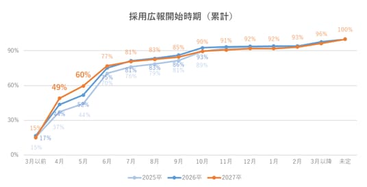採用広報開始の時期は年々早期化が進んでいる。2027年卒では、「4月開始」が全体の50%近くを占め、「5月」には6割に達した。夏季インターンシップなどの自社イベントの実施が定着し、春先から広報を開始する企業が増加していることが分かる(図4)。