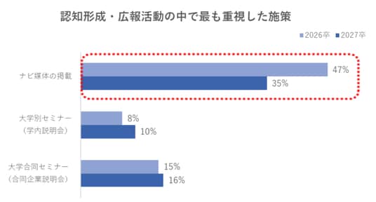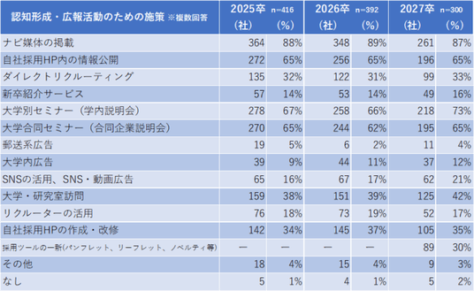 認知・広報活動においては、学内説明会への参加が7割に達し、前年より7ポイント増加。合同企業説明会も前年を上回っており、説明会を通じた広報活動が重視されている(表1)。ナビ媒体への掲載も依然として重視されているものの、前年よりやや減少しており、学生との直接的な接点を求める傾向にあると考えられる(図7)。さらに、学内説明会に加えて大学・研究室訪問の実施率も年々増加(表1)。大学ごとの個別アプローチを強化する動きがうかがえる。