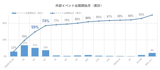 外部イベントの出展開始についても同様に4~6月に集中している。5月までに6割近くが出展し、6月には7割を超える結果となった。参加しない企業はわずか8%にとどまっており、早期からの外部イベント出展に意欲的な企業が多数を占めていることが分かる(図12)。