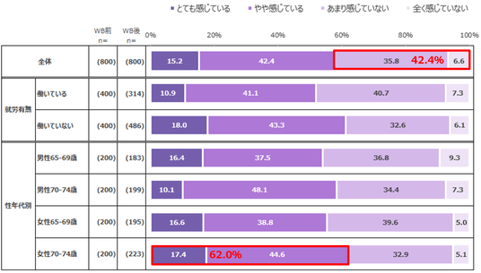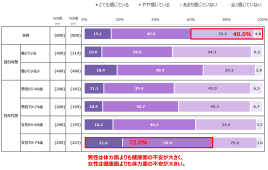 最も不安を感じているのは、70~74歳の女性で62.0%だった。「とても感じている」項目だけで見ると、70~74歳の男性が10.1%にとどまっている状況が分かった。