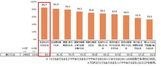 働いている人に、人生の中で「働くこと」の理由を尋ねたところ、「生活のメリハリのため」が84.7%で1位となった。2位には「生活費を稼ぐため」(81.9%)が続き、働く人は生活費を稼ぐ以上に生活のメリハリを重視していることが分かった。