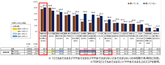 働いていない人で働きたくない理由が働いている人と10ポイント以上の差がついたのは、「生活費を稼ぐ必要がないから」(59.6%)、「趣味の足しのお金を稼ぐ必要がないから」(56.9%)、「新しいスキルや知識を覚えたくないから」(40.4%)であった。