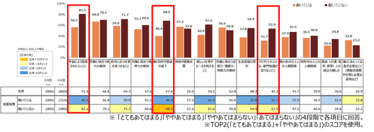 仕事をする上で感じている健康面、体力面に関する悩みや不安について尋ねたところ、全体では50.9%が「特に悩みや不安はない」が1位になった。働いていない人は「とっさの判断力が鈍くなった」が34.4%で働いている人(21.6%)と差が見られた。男性の70~74歳は他の層に比べて「トイレが近くなった」が33.7%で仕事への影響が見られた。女性の65~69歳は「足腰が弱くなった」「疲れやすくなった、疲れが取れにくくなった」「目が見えづらくなった」「物覚えが悪くなった」といった身体機能面での仕事への影響を強く感じていることも分かった。