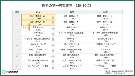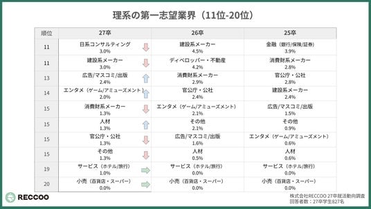 株式会社RECCOO(本社:東京都渋谷区、代表取締役 出谷昌裕)は、旧帝大・早慶・GMARCH等の上位校を中心とした2027年卒業予定学生827名を対象に「志望業界ランキング」を実施しました。本調査は、一般的なランキングでは見えにくい「優秀層」に特化した志向の変化を明らかにし、企業の戦略的な母集団形成を支援することを目的としています。