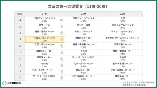 「金融」が17.4%で3年連続1位(前年比+3.4pt)。「官公庁・公社」が前年から順位を8つ上げ4位(8.1%)にランクインした一方で、「外資コンサルティング」は14位へと大きく後退しました。