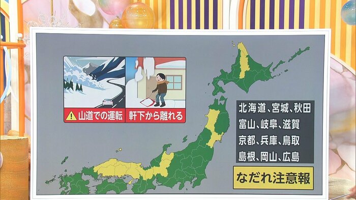 天達武史気象防災キャスターによると、現在(12日 朝8時時点)、北海道や宮城、秋田以外にも、北陸から中国地方にかけて広い範囲で「なだれ注意報」が発表されています。