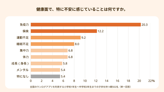 また、親が不安に思っていることは、「免疫力」はもちろんのこと「偏食」や「運動不足」、「睡眠不足」に直結するものです。