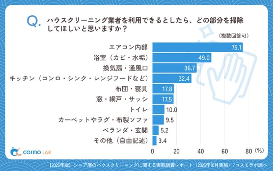 業者に掃除してほしい部分は「エアコン内部」(75.1%)が突出しました。次いで「浴室(カビ・水垢)」(49.0%)、「換気扇・通風口」(36.7%)、「キッチン(コンロ・シンク・レンジフードなど)」(32.4%)が続きます。