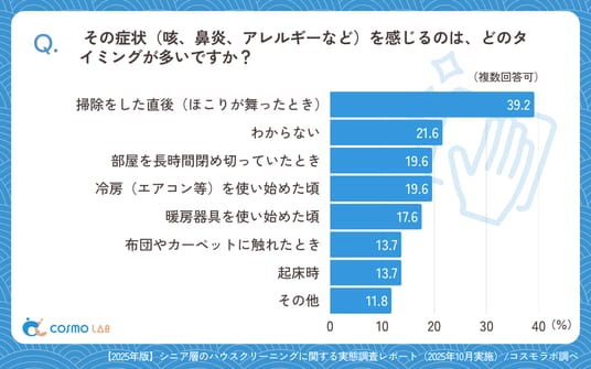 症状を感じるタイミングは「掃除をした直後(ほこりが舞ったとき)」(39.2%)が最多となりました。次いで「わからない」(21.6%)、「部屋を長時間閉め切っていたとき」(19.6%)、「冷房(エアコン等)を使い始めた頃」(19.6%)、「暖房器具を使い始めた頃」(17.6%)が続きます。
