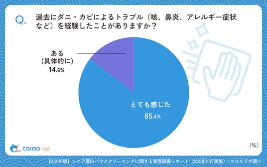 ダニ・カビによるトラブル経験は「ない」(85.4%)が大半を占めました。一方で「ある(具体的に)」(14.6%)も確認され、一定数が咳や鼻炎、アレルギー症状などの経験を有しています。