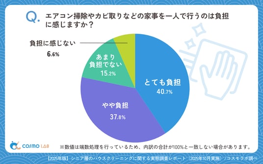 両者を合わせると 78.5% に達しており、シニア層の多くがエアコン掃除やカビ取りといった家事に対して強い負担を感じている実態が明らかになりました。一方で、「あまり負担でない」(15.2%)、「負担に感じない」(6.6%)は少数にとどまり、負担感が低い層は限定的です。