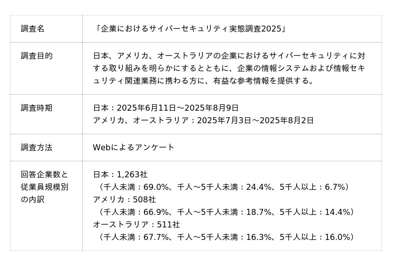 NRIセキュアテクノロジーズ株式会社(以下「NRIセキュア」)は、2025年6月から8月にかけて、日本、アメリカ、オーストラリア3か国の企業計2,282社を対象に、サイバーセキュリティに関する実態調査を実施しました。この調査は、2002年度から実施しており、今回で23回目となります[i]。
